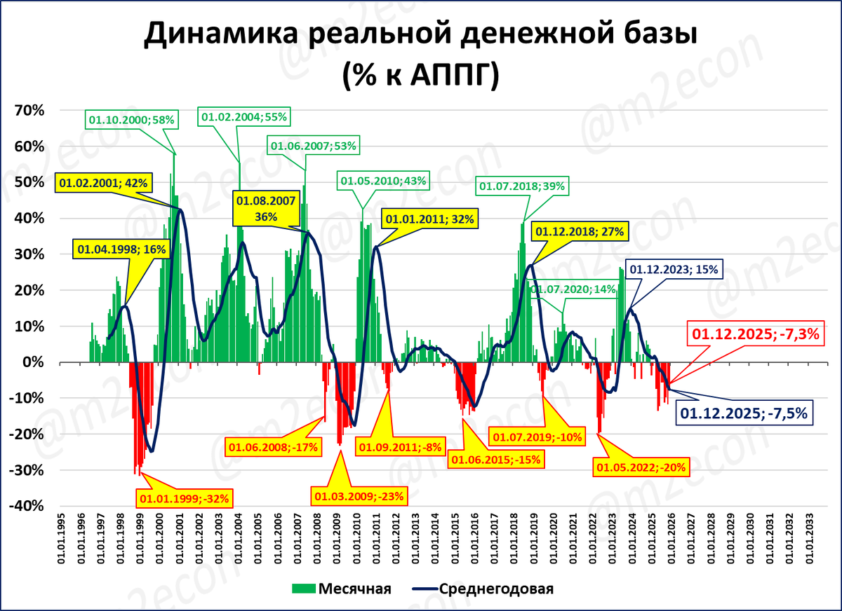 В реальном выражении (с учётом инфляции 6,6% годовых) падение денежной базы ещё сильнее: -7,3%.