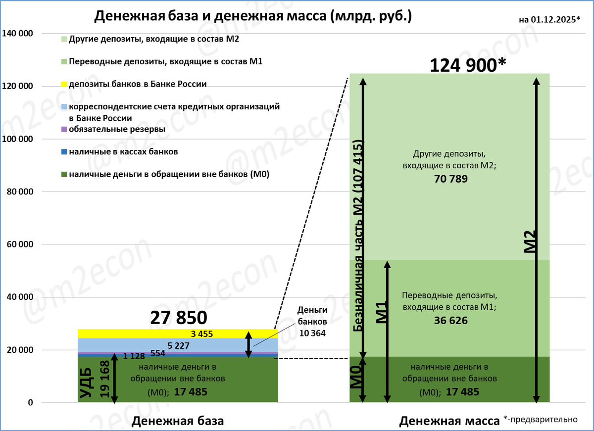 На 1 декабря денежная масса, по предварительной оценке ЦБ, составила 124,9 трлн рублей, а денежная база 27,85 трлн рублей,