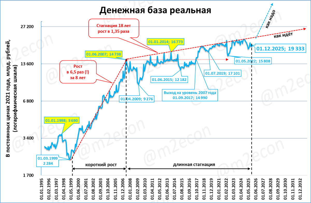 С 1999 по 2007 год реальная денежная база росла быстро, увеличившись в 6,5 раз за 8 лет. Но затем падения начали чередоваться слабым ростом (точнее, восстановлением). И за последующие 18 лет денежная база выросла всего в 1,35 раза.