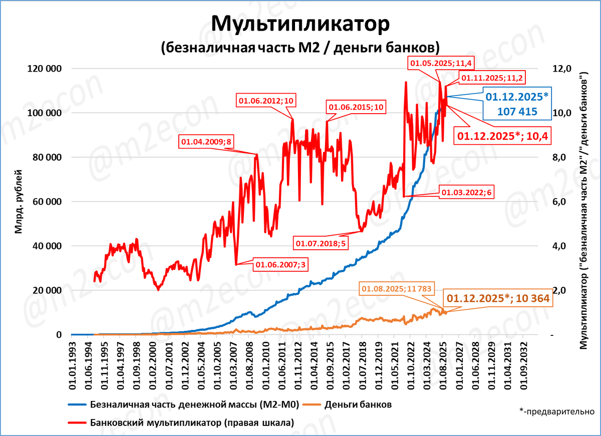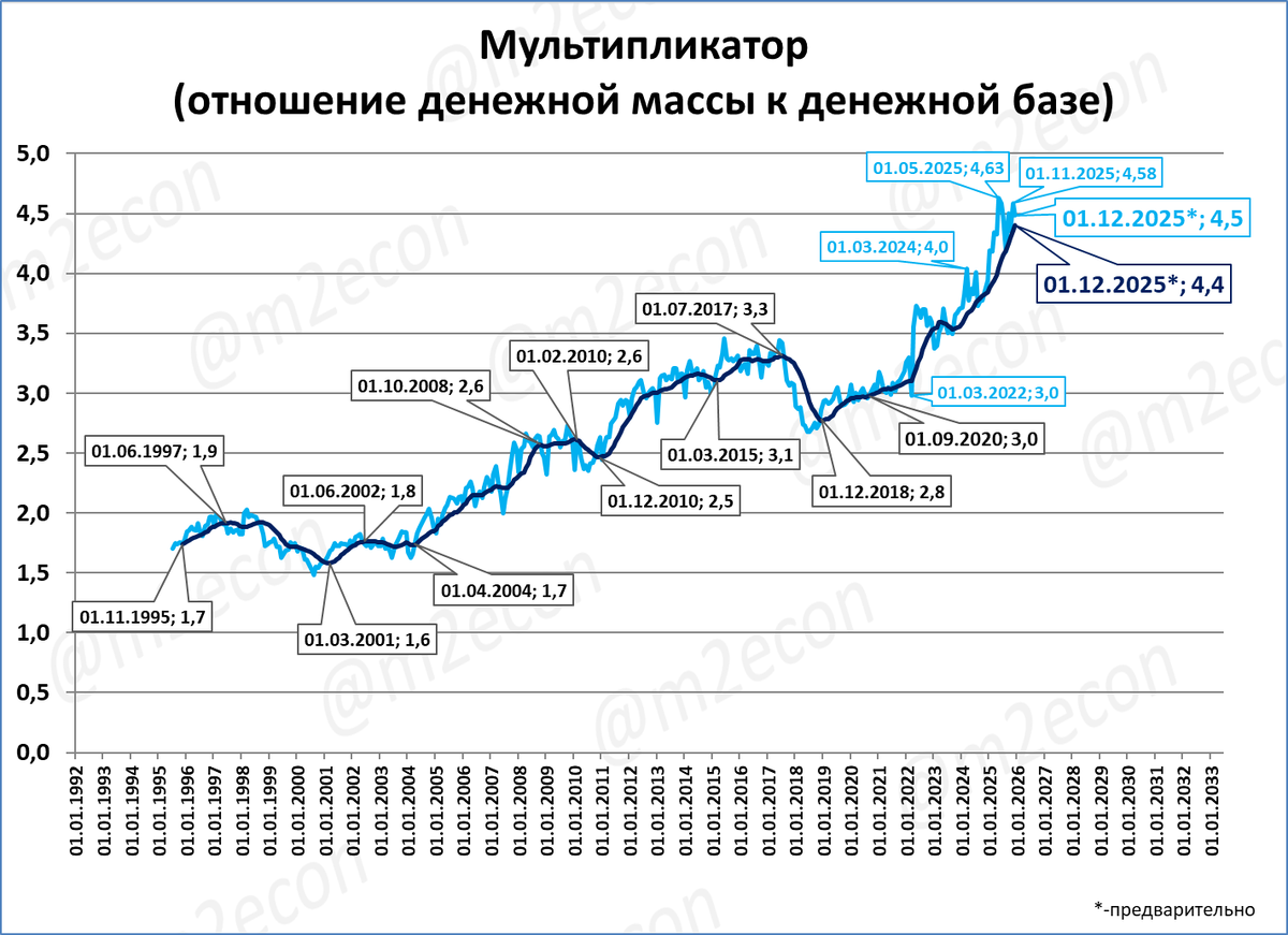Отношение денежной массы к денежной базе (денежный мультипликатор) на 1 декабря 2025 года составило 4,5.