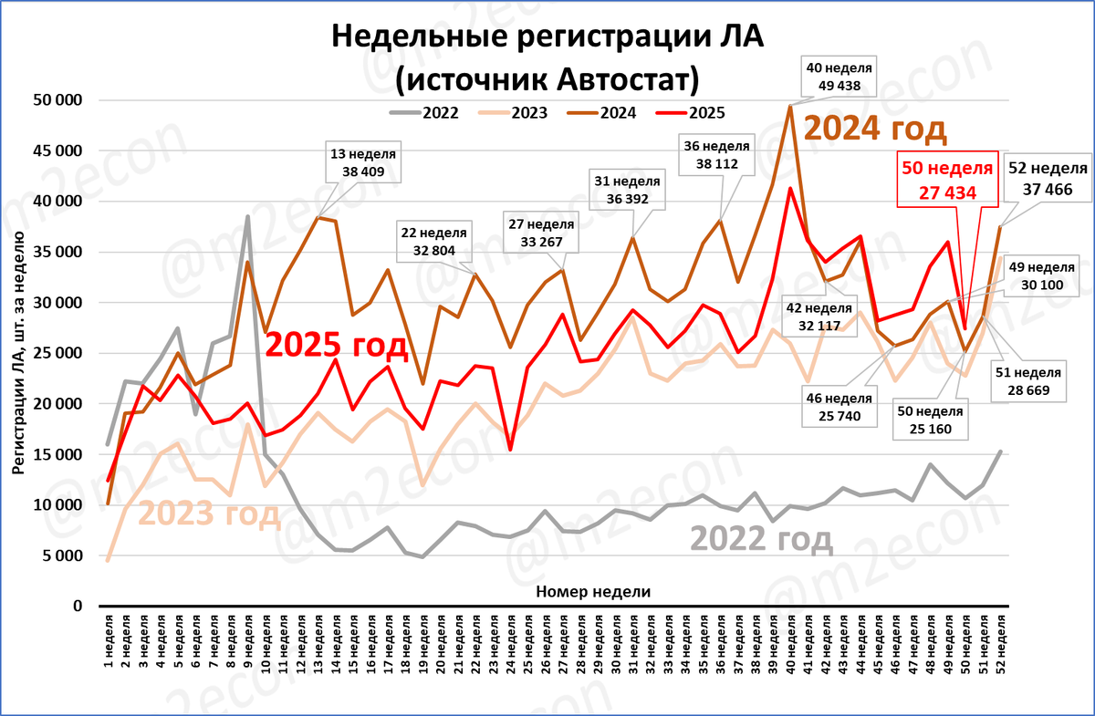 По данным агентства «Автостат», регистрации легковых автомобилей на 50 неделе составили 27,4 тыс. шт.