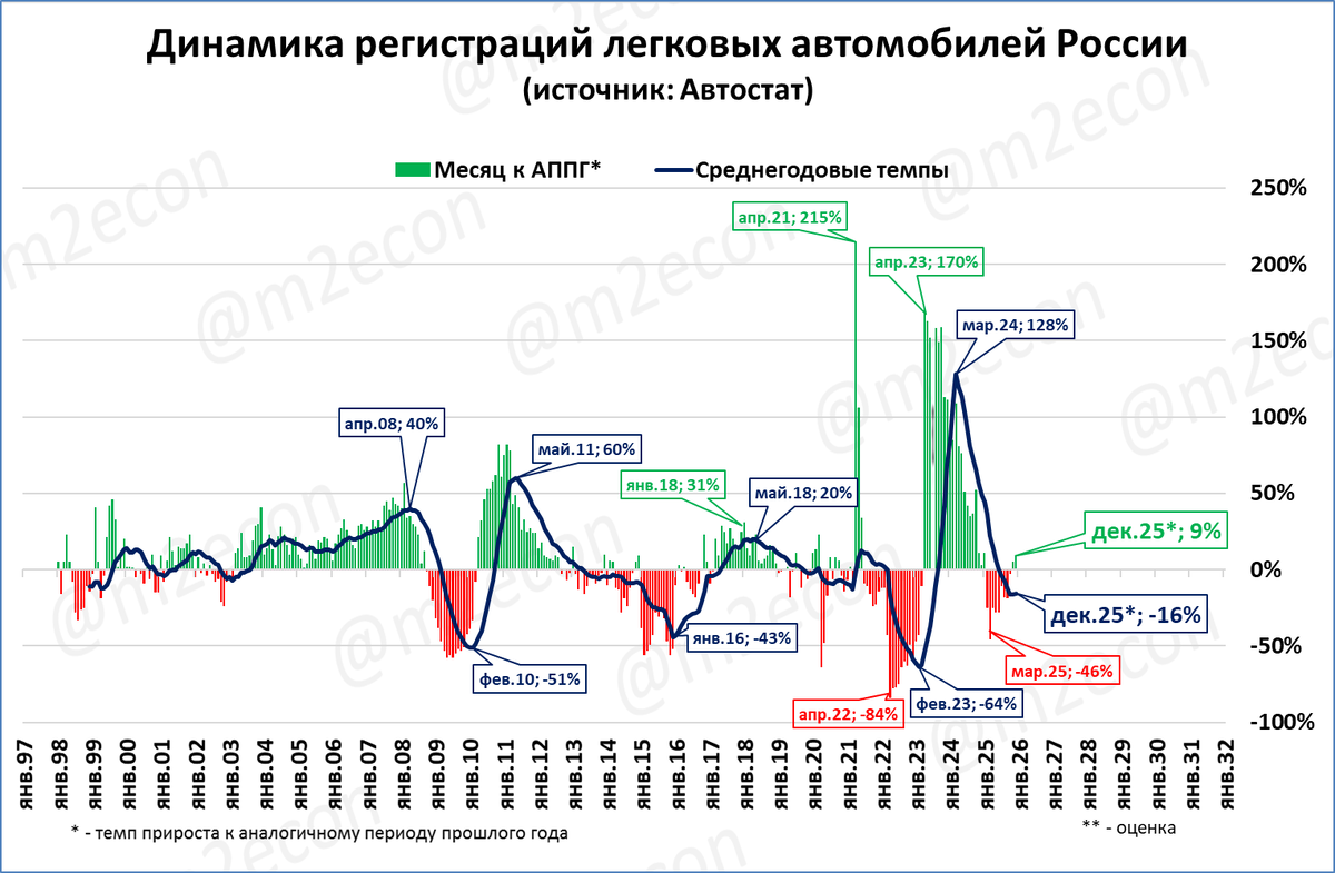 Рынок легковых автомобилей, судя данным 50 недели, в декабре составит 135 тыс. (+9%). Итоги 2025 года будут порядка 1,32 млн. (-16%).