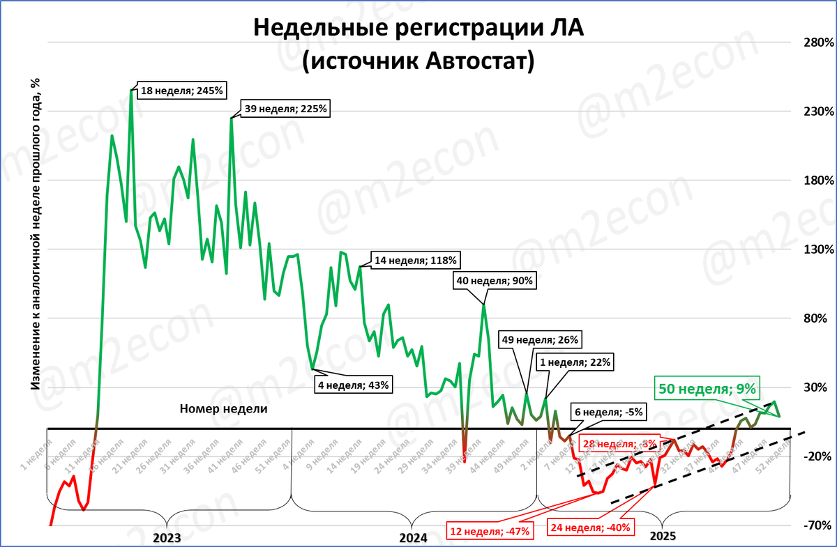 Динамика худшей была на 12 неделе (-47%), и с тех пор она улучшается. Девятую неделю подряд динамика находится в зелёной зоне роста.