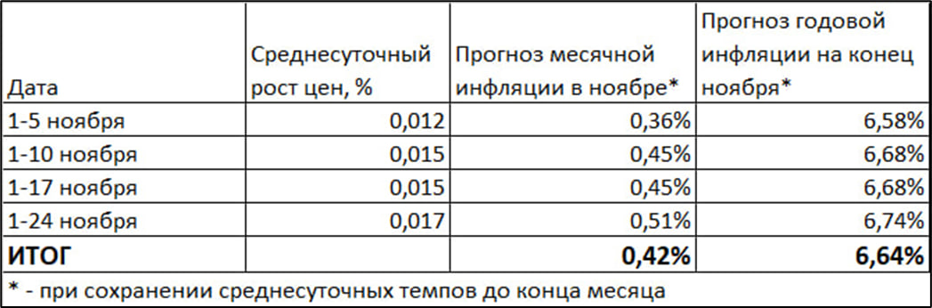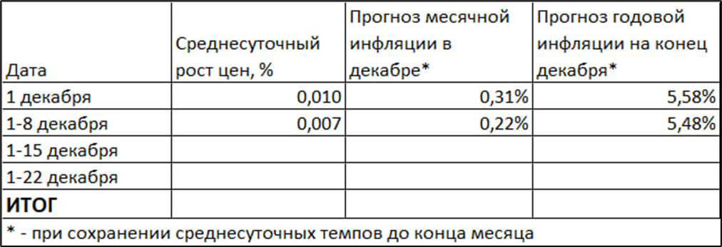 Если среднесуточный рост цен будет на уровне 0,007%, то по итогам декабря годовая инфляция может снизиться до 5,5%