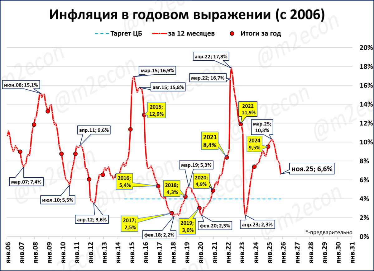 Инфляция по итогам ноября составила 6,6% годовых. В декабре, судя по недельным данным, она снизится до 5,5% годовых.