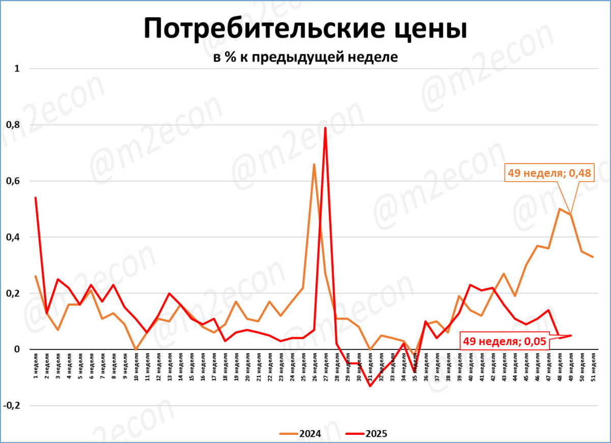 Рост цен за 49 неделю (0,05%) на порядок ниже, чем за 49 неделю прошлого года (0,48%).