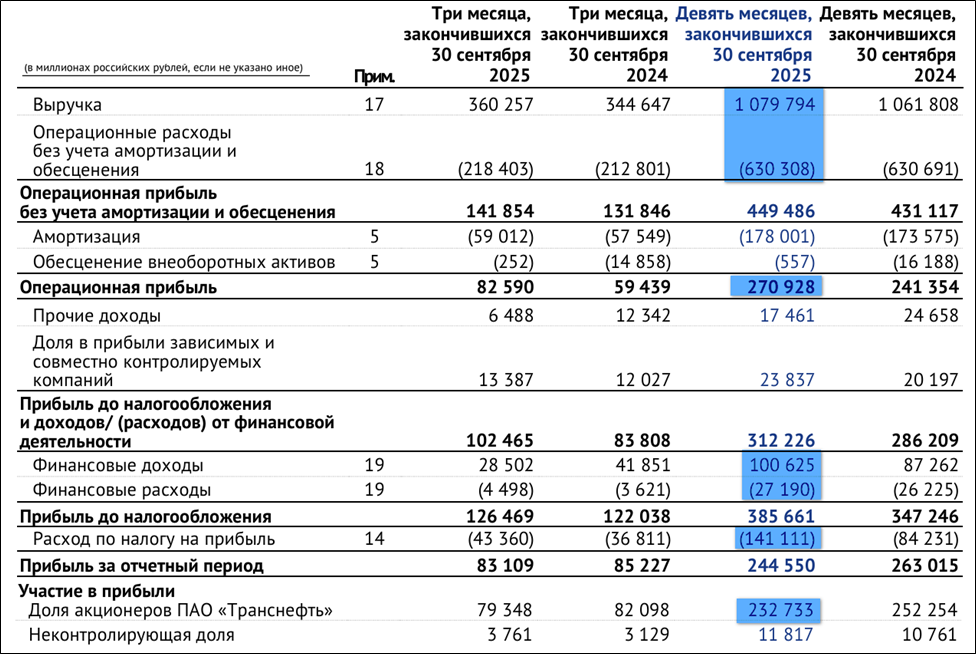 Выручка за 9М 2025 года выросла на 2% г/г. Основные факторы: рост тарифов на 10% и снижение объемов транспортировки нефти. Операционные расходы не изменились. В результате, операционная прибыль +12% г/г.