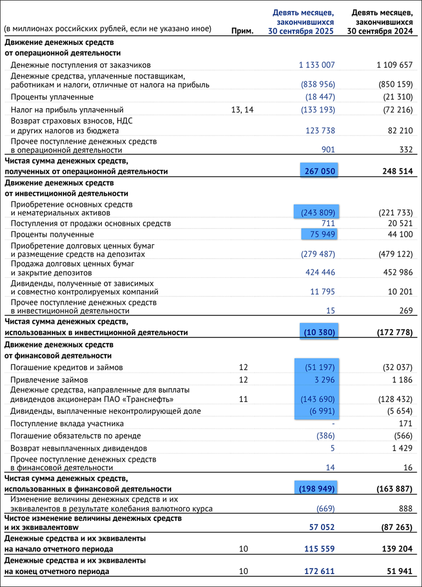 Инвестиционный: -10 млрд (-17х г/г). Капитальные затраты 244 млрд (+10%). 76 млрд Транснефть получила процентами от финансовых активов. И более 11 млрд дивидендами от зависимых компаний.
