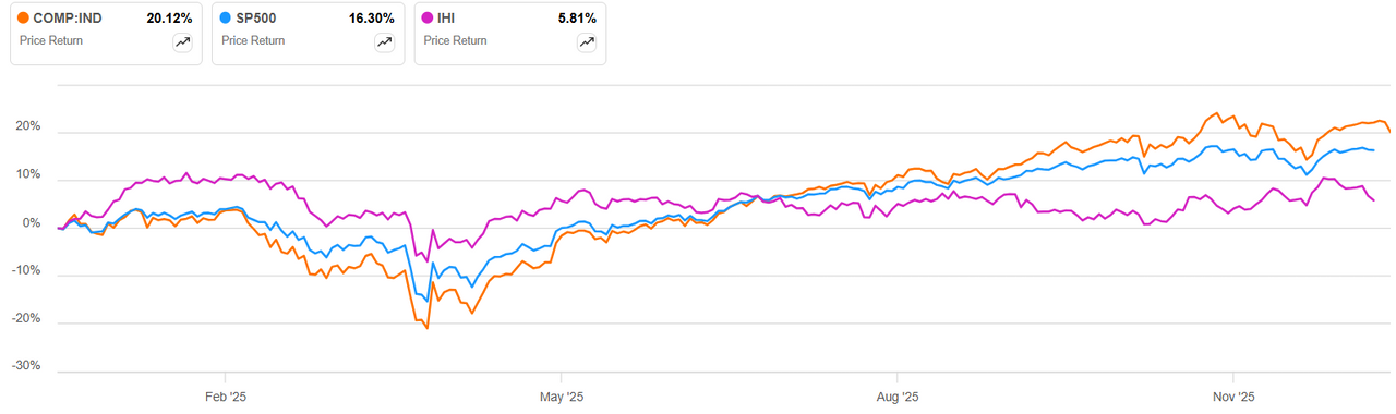 Динамика доходности Ishares U.S. Medical Devices ETF и индексов S&P 500 и Nasdaq Composite YTD