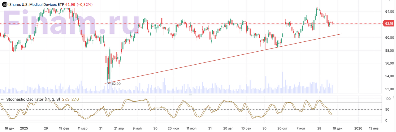 Рассматриваемый индексный фонд за период с начала года отстает от рынка по доходности — iShares U.S. Medical Devices ETF прибавил в цене 6% с начала года, тогда как индекс широкого рынка S&P 500 показал рост на 16%, а индекс NASDAQ Composite поднялся на 20%. С учетом того что степень неопределенности для отрасли за последние месяцы несколько снизилась и многие крупные компании медтеха озвучили достаточно конструктивные прогнозы по финансовым результатам, несмотря на потенциальное влияние трамповских тарифов, мы считаем, что в ближайший год iShares U.S. Medical Devices ETF сумеет показать доходность выше рыночной.