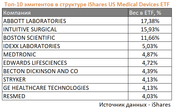 Наибольшие доли в рассматриваемом ETF имеют производители медицинского оборудования Abbott Laboratories, Intuitive Surgical, Boston Scientific, Idexx Labs и Medtronic, из три которых включены в наше аналитическое покрытие с рейтингами «Покупать» или «Держать».