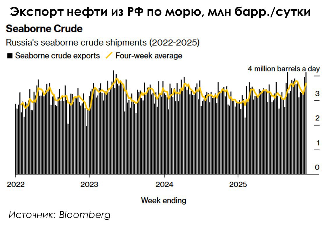 По данным Bloomberg, экспорт российской нефти по морю снизился с 3,77 мбс (млн барр./сутки) в октябре 2025 г. до 3,68 мбс в ноябре (на 2,4%), а на первой неделе декабря вырос до 4,24 мбс (на 15,2%). Объем нефти в хранилищах на танкерах вырос примерно с 156 млн барр. в начале октября до 164 млн барр. в ноябре и до 178 млн барр. на первой неделе декабря.