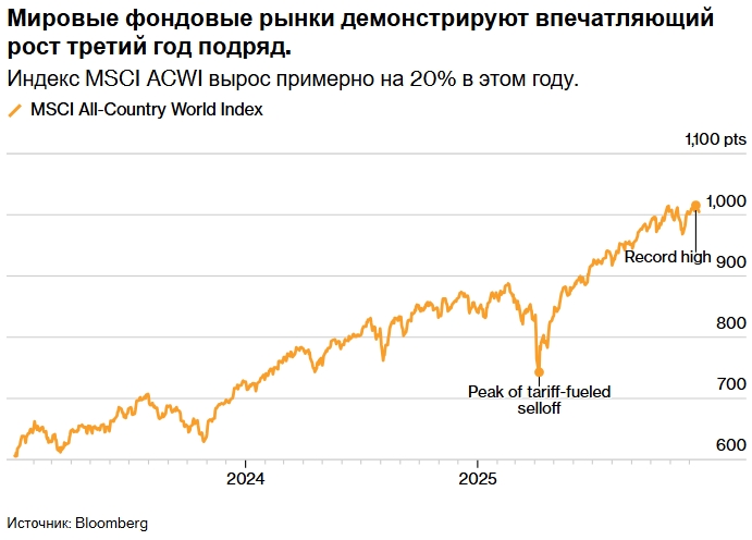 Индекс MSCI All-Country World вырос на почти 20% в 2025 году, продемонстрировав двузначный рост третий год подряд. Это стало возможным благодаря снижению процентных ставок центральными банками на фоне устойчивого экономического роста. Несмотря на опасения по поводу возможного пузыря на рынке технологий в США, уверенность в экономической стабильности подняла основные фондовые индексы до почти рекордных уровней.