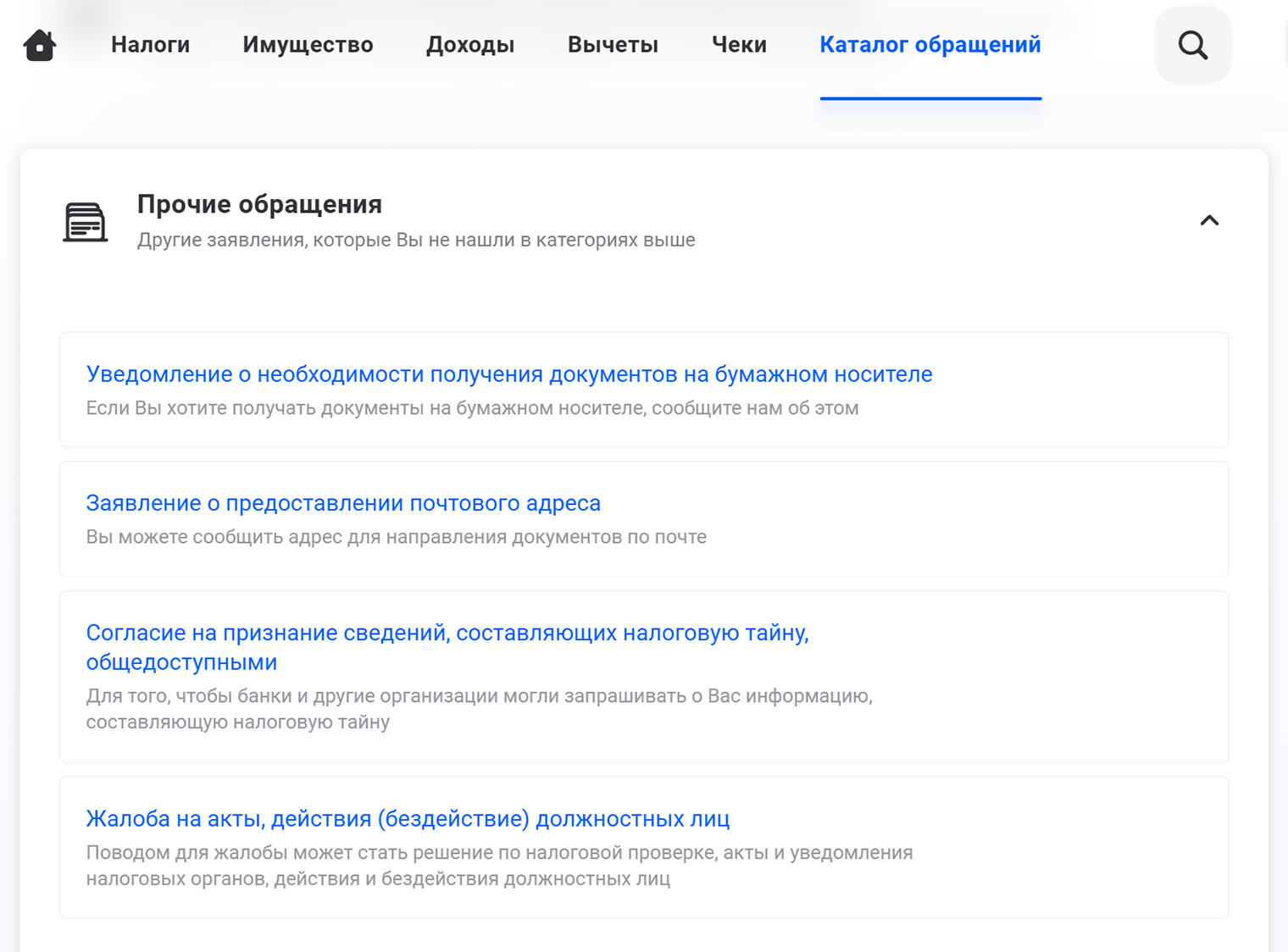 Перейдите во вкладку «Каталог обращений», затем выберите «Прочие обращения» и раздел «Жалоба на акты, действия (бездействие) должностных лиц»