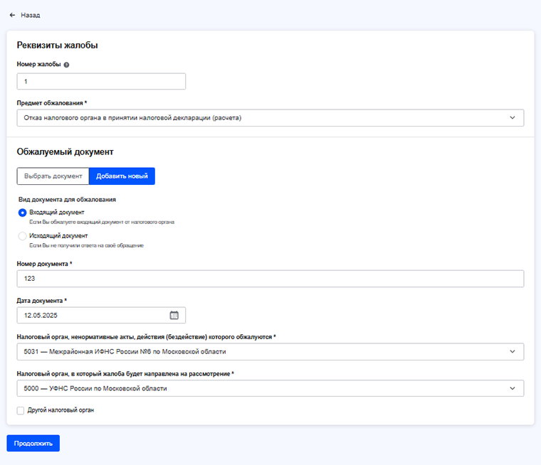 Укажите реквизиты документа, который обжалуете, если он есть, налоговую инспекцию, действия или бездействие которой оспариваете, и вышестоящий налоговый орган, куда отправляете претензию. Его можно выбрать из списка