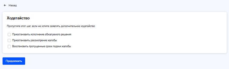 Поставьте галочки там, где они нужны. Дальше появится дополнительное окно, где надо будет ввести пояснения по ходатайствам
