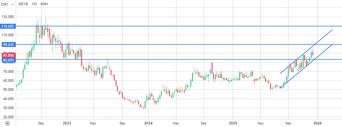 С технической точки зрения на недельном графике акции Ningbo Deye Technology на данный момент торгуются в рамках среднесрочного восходящего тренда. Ближайшим сопротивлением является уровень RMB 100, пробой которого мог бы открыть дорогу для роста к максимумам 2022 г. В то же время ключевым уровнем поддержки в случае коррекции выступит отметка RMB 83.