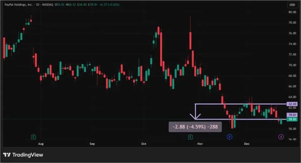 Топовую тройку открывает платежный сервис PayPal, рыночная капитализация которого составляет $57,14 млрд. Он не только осуществляет платежи с использованием цифровых активов, но также имеет свой собственный стейблкоин PYUSD. В декабре акции PayPal снизились на 4,59%. Большую часть месяца ценные бумаги PYPL торговались в боковике, не обращая внимания на новости, в том числе о снижении ставки ФРС. А вот после 15 декабря они заметно просели в цене после того, как три крупных финансовых организации — Morgan Stanley, Bank of America и JP Morgan — одна за другой понизили их рейтинг. Также опасения инвесторов могут быть связаны с медленной монетизацией сервиса Venmo, принадлежащего PayPal.