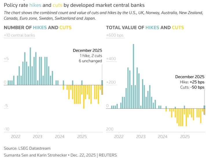 Крупнейшие центральные банки снизили процентные ставки в 2025 году самыми быстрыми темпами и в самом большом масштабе со времен финансового кризиса, в то время как политика развивающихся стран также ускорила смягчение денежно-кредитной политики.