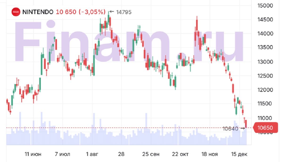 Nintendo известна выпуском игровых приставок и других систем с эксклюзивной библиотекой игр. Акции торгуются на Токийской фондовой бирже с тиккером 7974. Они показали спад в последнее время, обвалившись примерно на 24% с начала ноября. Сейчас их стоимость находится в районе 10 650 иен.
