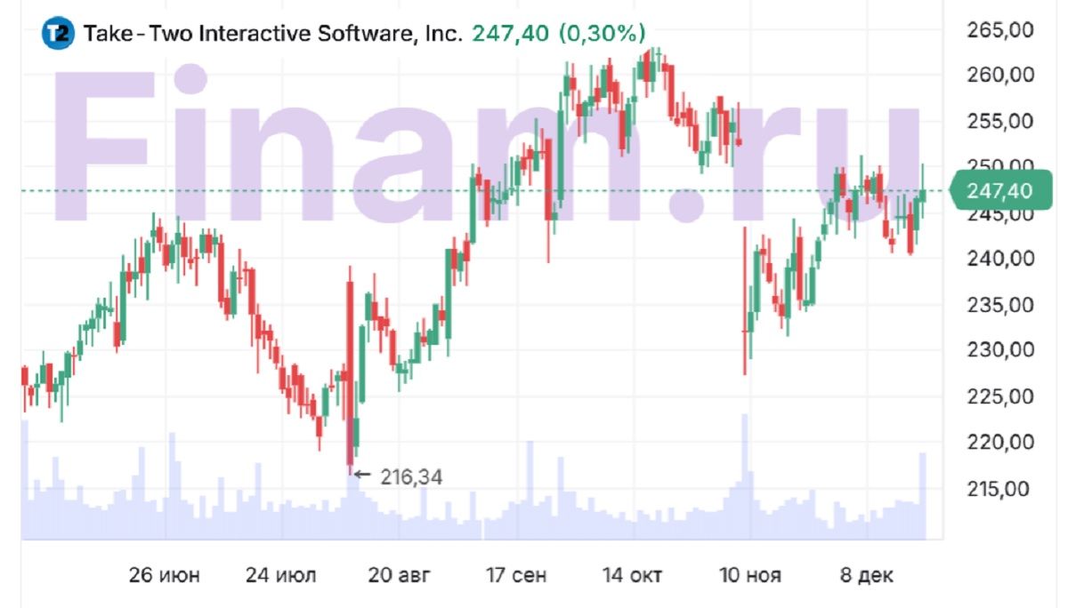 Акции Take-Two Interactive Software (TTWO) торгуются на бирже NASDAQ. В последний месяц они показывают боковую динамику, их цена сейчас находится в районе 247 долларов.