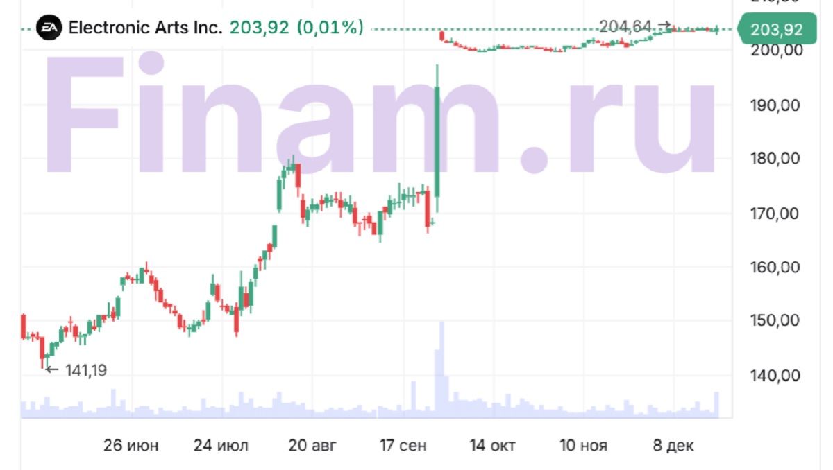Среди популярных игр Electronic Arts – серии Battlefield, Command & Conquer, Need for Speed, The Sims, SimCity, Plants vs. Zombies. Акции Electronic Arts (EA) также торгуются на NASDAQ. С конца сентября они находятся в боковике, однако с начала года показали рост примерно на 40%. Сейчас акции стоят $203,92.