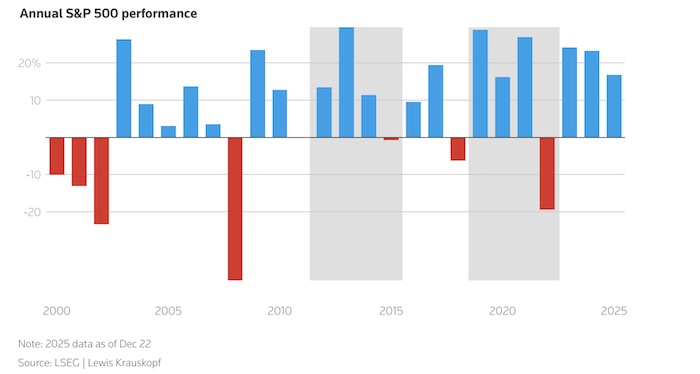 Американский фондовый рынок завершает третий год подряд с двузначным ростом. Но сможет ли он показать такой же впечатляющий результат в четвертый раз? Для этого потребуется сочетание сильных корпоративных доходов, «голубиной» политики ФРС и продолжающегося бума расходов на искусственный интеллект.