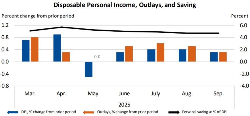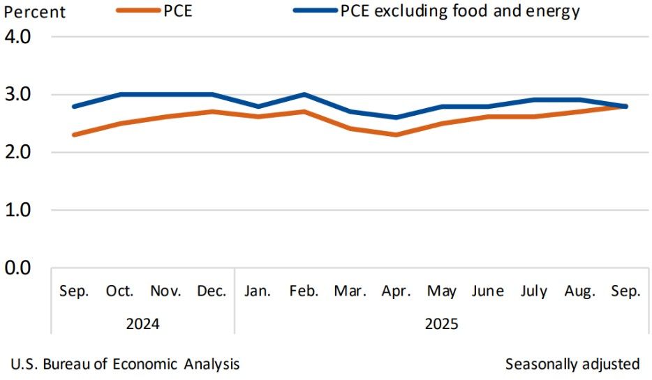 Инфляция в США демонстрирует признаки замедления, но остается выше целевого ориентира ФРС. По данным Министерства торговли, в сентябре базовый индекс PCE вырос на 0,2% (м/м) и 2,8% (г/г) (против 2,9% (г/г) в августе). Заголовочный индекс PCE вырос на 0,3% (м/м) и 2,8% (г/г). Цены на товары увеличились на 0,5% (м/м), на услуги — на 0,2% (м/м). Продовольственная инфляция — на 0,4% (м/м), энергоносители — на 1,7% (м/м).