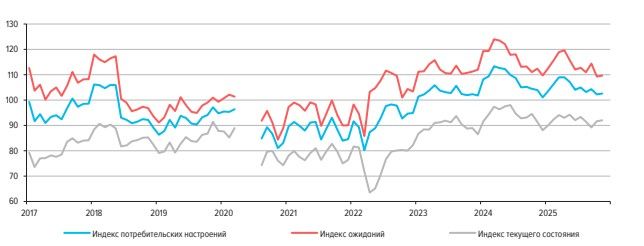 Во второй половине 2025 года потребительский сектор России столкнулся с дальнейшим охлаждением, которое, по оценке Банка России, продолжится как минимум в I полугодии 2026 года. Потребительские настроения остаются под давлением: население продолжает фиксировать высокие инфляционные ожидания, что сдерживает восстановление спроса даже на товары базового (продовольственного) спроса. Индекс потребительских настроений по-прежнему находится на пониженных уровнях, ухудшились как оценки текущего положения, так и ожидания на ближайшее будущее. В октябре и ноябре темпы роста (г/г) реальных потребительских расходов перешли в отрицательную зону.