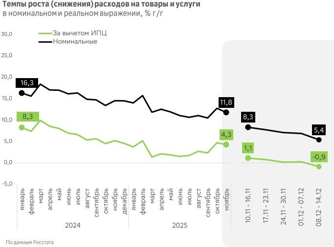 Во второй половине 2025 года потребительский сектор России оказался под сильным давлением: впервые за несколько лет фиксируется устойчивое снижение реальных расходов населения даже на основные товары, что связано с замедлением роста доходов и сохранением высокой ключевой ставки.
