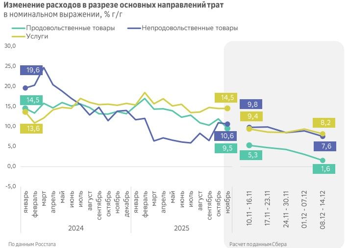 Ослабление спроса в ноябре особенно заметно в сегменте бытовой техники (-19,4% (г/г)), а также в автоторговле, где продажи упали на 8,3% в годовом выражении. Переход на электромобили и снижение спроса на бензин привели к снижению розничной реализации топлива на 8%. Некоторые категории, такие как общественное питание, косметика, товары первой необходимости и ювелирные изделия, сохранили положительную динамику, однако их вклад оказался недостаточным для компенсации общего замедления.