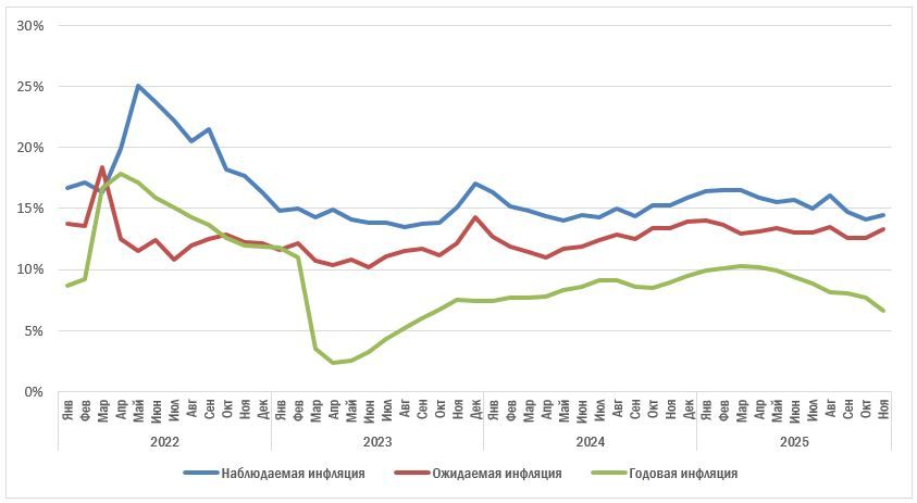 В ноябре 2025 года инфляция в России продолжила уверенное замедление: годовой прирост цен составил 6,6%, что стало минимальным значением с сентября 2023 года. Месячный прирост цен с сезонной корректировкой в пересчете на год (с.к.г.) снизился до 2,2%. Замедление зафиксировано как в устойчивых, так и в волатильных компонентах инфляции: по большинству товаров и услуг средние темпы роста цен за осенние месяцы оставались выше 4% в годовом выражении, однако по итогам ноября темпы инфляции снизились практически по всем группам. В отличие от предыдущих периодов, волатильные компоненты (овощи, фрукты и яйца) — дорожали значительно слабее обычного, а цены на бензин даже снизились. Банк России сохраняет жесткую риторику и будет поддерживать такие условия денежно-кредитной политики, которые необходимы для возврата инфляции к целевому уровню.