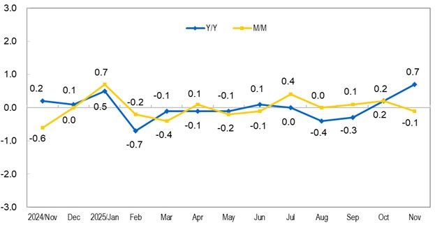 В ноябре 2025 года потребительская инфляция в Китае ускорилась, достигнув 0,7% (г/г) — максимального значения почти за два года, в основном благодаря подорожанию свежих овощей и росту цен на золото, а также поддержке со стороны государственных стимулирующих мер. Однако ускорение CPI не говорит о полном восстановлении потребительского спроса: темпы базовой инфляции (core CPI без продовольствия и энергии) остались на уровне 1,2% (г/г), тогда как производственная инфляция (PPI) продолжила падать, углубившись до -2,2% — это отражает сохраняющееся давление на производителей и явное перепроизводство в ряде индустрий.