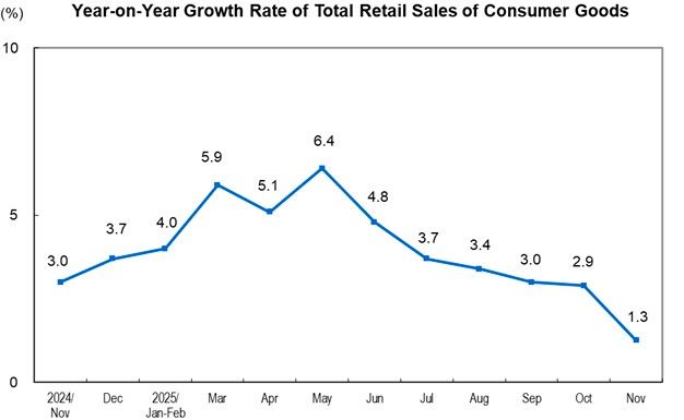 В конце 2025 года потребительский сектор Китая демонстрирует умеренно негативную динамику: рост розничных продаж замедлился до 1,3% (г/г) в ноябре, а слабость рынка недвижимости и инвестиций продолжает давить на расходы домохозяйств.
