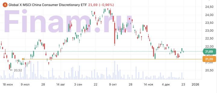 На фоне структурных рисков и замедления потребительского спроса в Китае интерес могут представлять отдельные диверсифицированные инструменты, такие как ETF CHIQ, торгующийся сейчас со значительной скидкой к своей целевой цене. Фонд дает широкую экспозицию на лидеров китайского потребительского сектора, включая крупнейшие онлайн-платформы (PDD, Alibaba, JD.com), автопроизводителей (BYD, Geely, XPeng) и компании сферы розничных услуг, что позволяет получить выгоду от точечного роста даже в условиях общего замедления рынка.