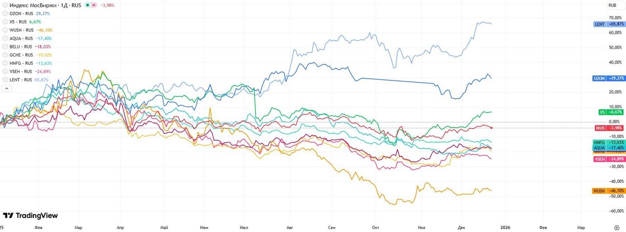 Динамика российских индексов и акций эмитентов, обращающихся на Московской бирже, с начала 2025 года