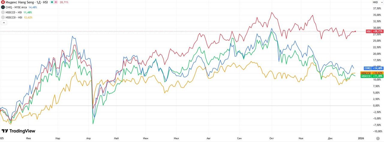 Ребазированная динамика китайских индексов в HKD с начала 2025 года