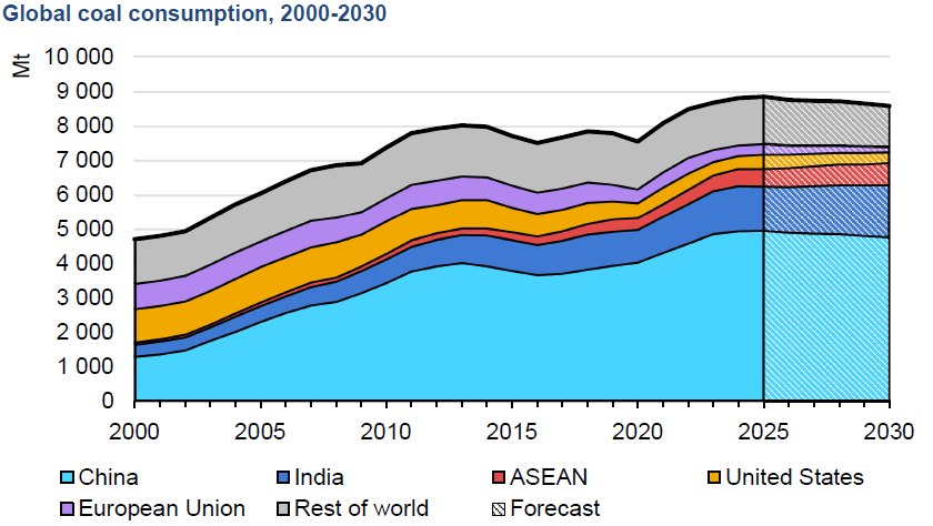 МЭА обращает внимание, что спрос на уголь до 2030 г. будет оставаться стабильным, но к концу 2030 г. произойдёт снижение (спрос составит 8 579 млн. т.). Агентство прогнозирует, что спрос достигнет уровня, который наблюдался в годы до 2023 г.: доля Китая остается доминирующей, хотя его спрос на уголь снижается очень медленно по мере расширения возобновляемых источников энергии и сдвига роли угля в энергетическом секторе в сторону гибкости. Индия становится основным источником дополнительного спроса, добавив 225 млн. т. в период с 2025 по 2030 год, в то время как страны АСЕАН вносят 127 млн. т., в первую очередь Индонезия и Вьетнам.