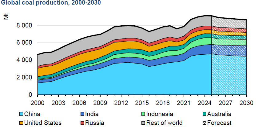 Ключевой страной-производителем является Китай, который добывал в 2024 г. порядка 4 666 млн. т. угля. МЭА обращает внимание, что уголь остается основным источником энергии как в Китае, так и в Индии, что делает внутреннее производство краеугольным камнем их стратегий энергетической безопасности. После дефицита поставок в 2021 году обе страны несколько лет подряд наращивали добычу угля.