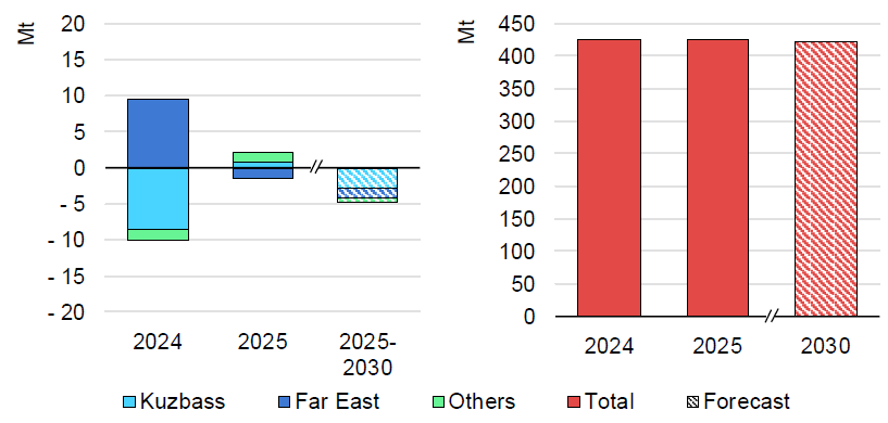 К 2030 г. МЭА ожидает, что добыча снизится до уровня 422 млн. т., т.е. всего на 1% по сравнению с уходящим 2025 г. МЭА пишет, что в целом спрос Китая на российский уголь, скорее всего, поддержит производство, особенно в восточных регионах.