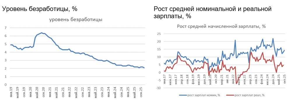 Динамика зарплат (данные за октябрь) вновь ускорилась, безработица вернулась к историческому минимуму (2,1%). Данные Росстата пока не дают возможности сделать вывод о заметном смягчении жесткости на рынке труда, хотя оперативные данные (например, индекс hh) указывают на сокращение вакансий и нарастание конкуренции работников за рабочие места.