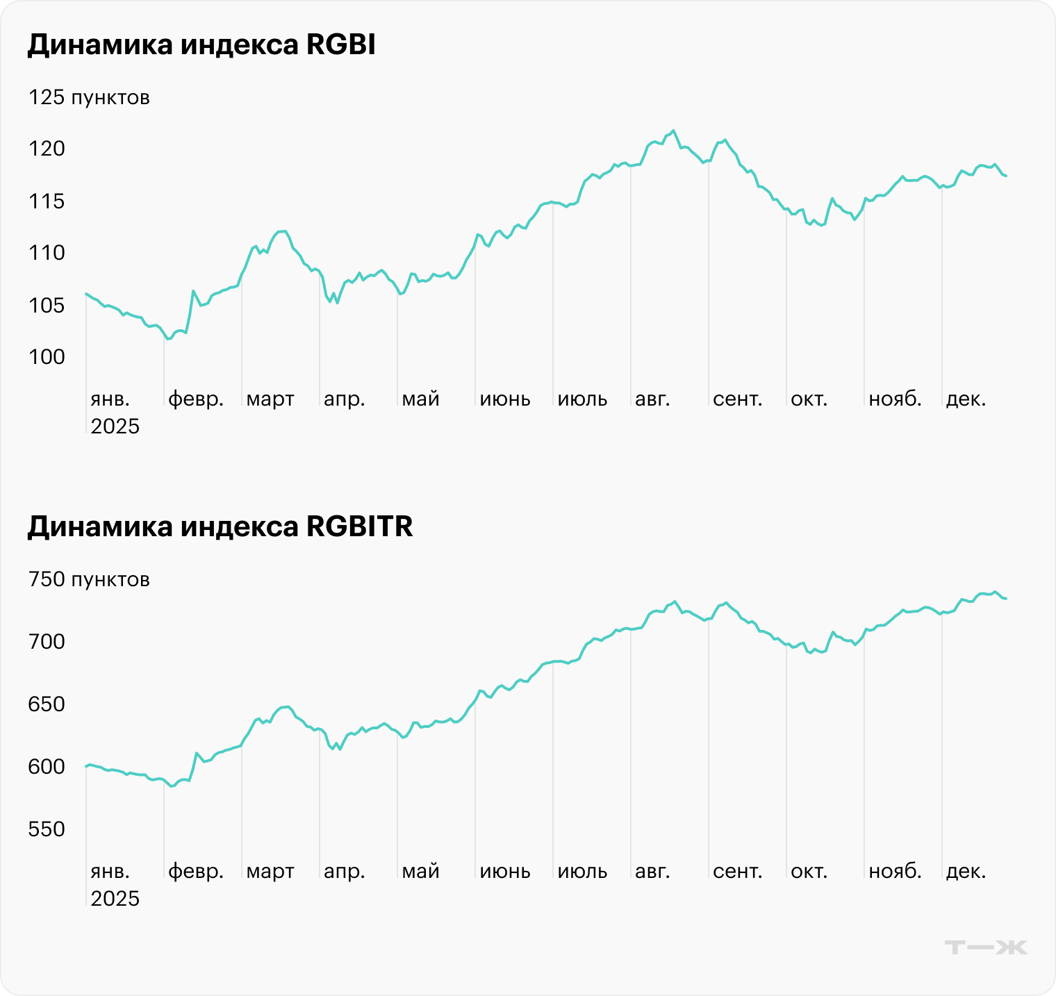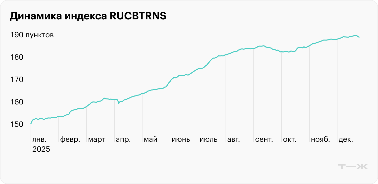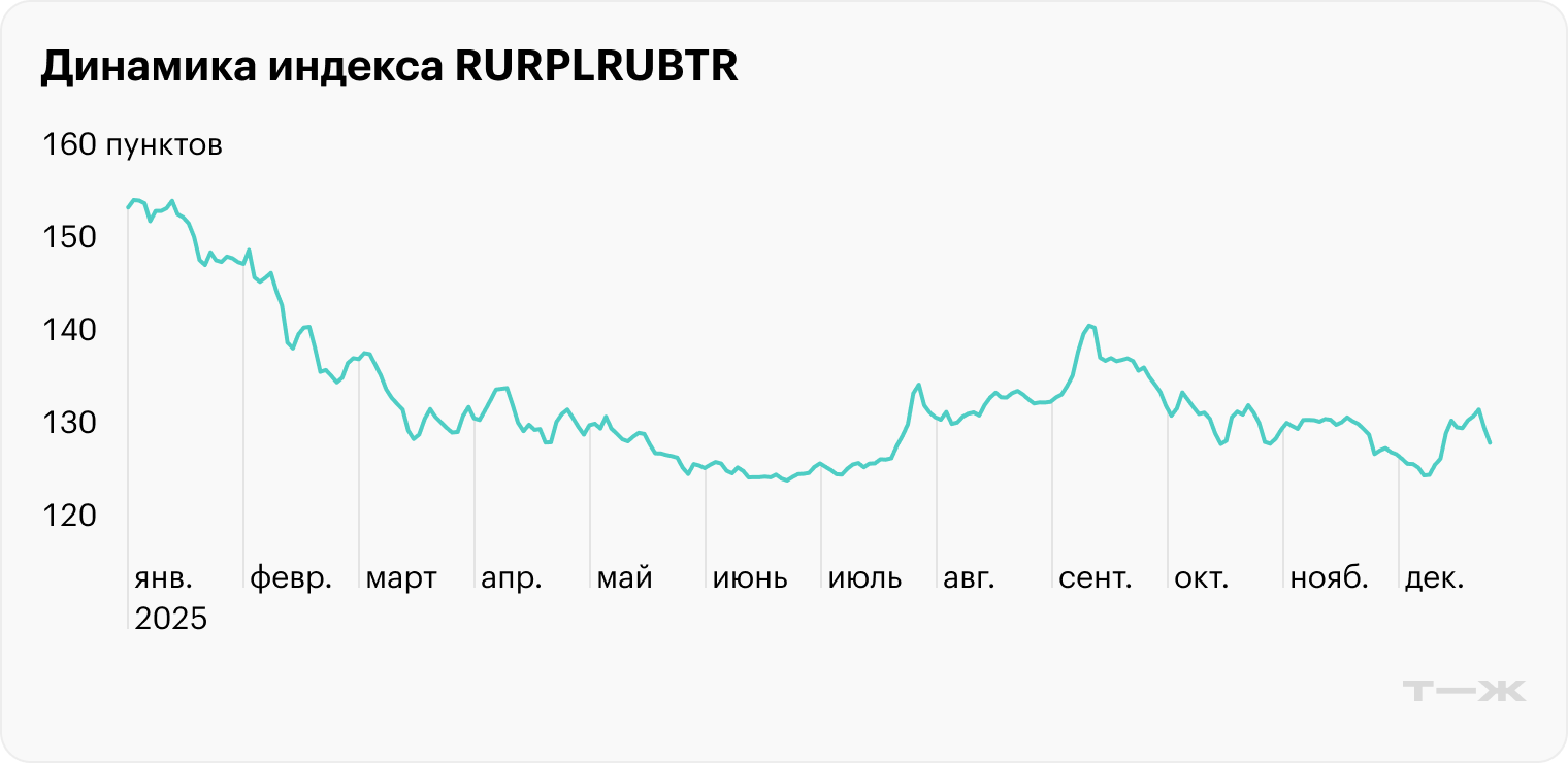 Индекс RGBI, который отражает динамику цен ОФЗ, с начала 2025 года вырос на 10,2%, до 117,5 пунктов. Лучший момент был в августе: тогда на ожиданиях быстрого снижения ставки индекс пробивал отметку в 122 пункта, но позже скорректировался.