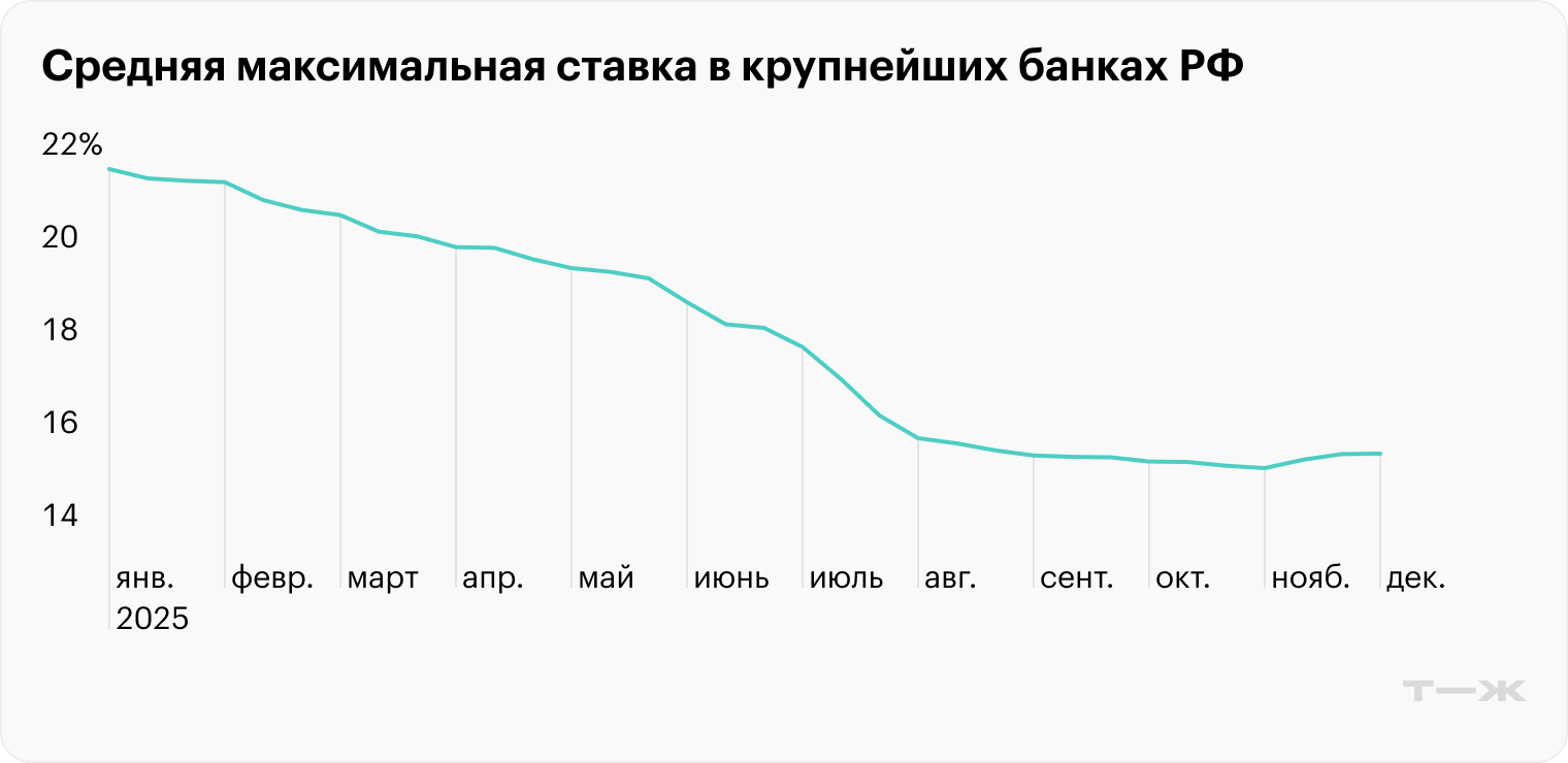 В начале 2025 года максимальные ставки по вкладам в крупнейших банках достигали 23—24% на фоне рекордной ключевой ставки. Оставалось зафиксировать эту доходность в январе на ближайший год и ждать выплаты процентов. К концу года ставки по вкладам опустились ниже 16%.