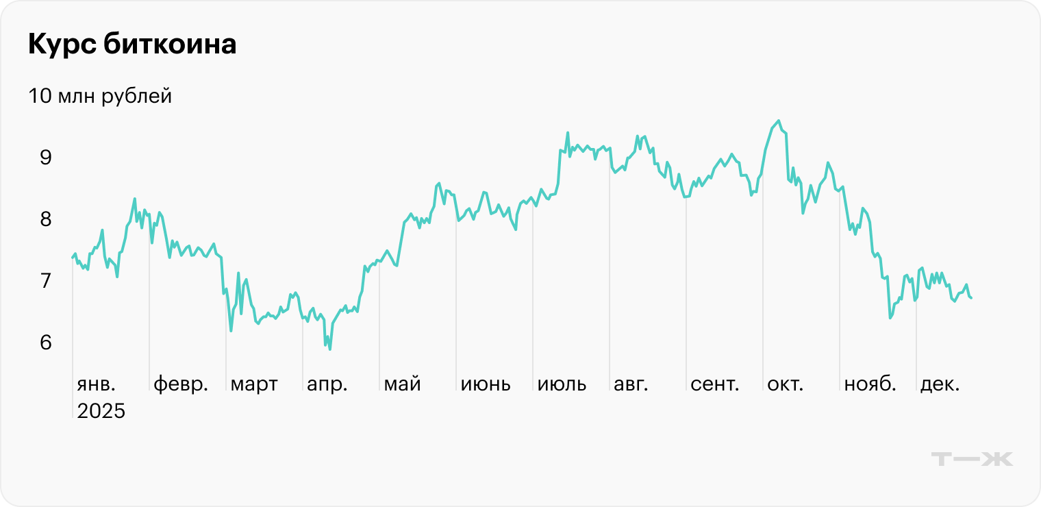 Биткоин. В 2025 году рынок криптовалют штормило: за короткое время котировки могли падать и расти на десятки процентов. Цена самой популярной криптовалюты — биткоина — с начала года снизилась на 4,2%, а за последние три месяца — на 26%. При этом за весь период она проседала на 18% и отскакивала на 33%.