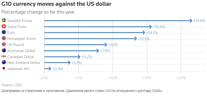 Индекс доллара, который показывает курс американской валюты по отношению к другим, готовился к падению на 9,6% в год, что стало самым значительным снижением за последние восемь лет. Это произошло из-за ожиданий снижения процентных ставок ФРС, уменьшения разницы между ставками США и других стран, а также опасений по поводу дефицита бюджета и политической нестабильности.