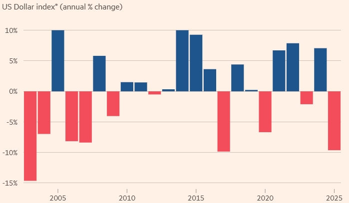 Хотя первоначальное ослабление доллара было вызвано введением Трампом в апреле агрессивных пошлин против торговых партнеров США — в какой-то момент он упал на 15 процентов по отношению к основным валютам, прежде чем немного восстановиться, — возобновление снижения процентных ставок ФРС в сентябре продолжает оказывать на него давление.