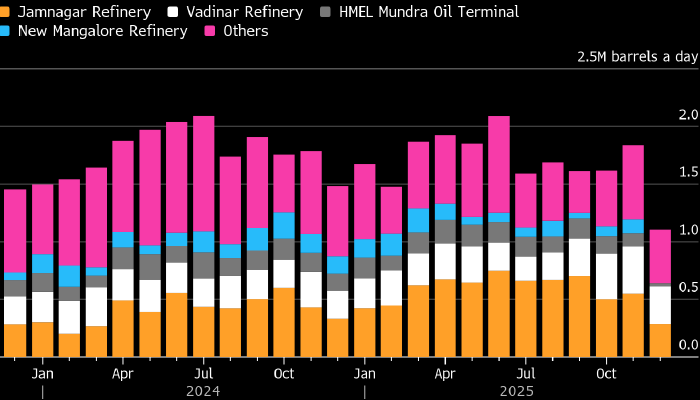 Ожидается, что по итогам декабря поставки российской нефти в Индию составят около 1,1 млн б/д (против 1,8 млн б/д в ноябре), что станет самым низким показателем с ноября 2022 года. Тем не менее, это все равно выше пессимистичных оценок на уровне 0,8 млн б/д, сделанных ранее в этом месяце индийскими чиновниками.