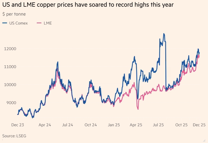 В декабре цена на этот красный металл достигла рекордной отметки свыше 12 000 долларов за тонну. В 2025-м она подскочила более чем на треть, что стало самым значительным годовым ростом с 2009 года, когда стоимость меди взлетела более чем на 140 % на фоне выхода из финансового кризиса.
