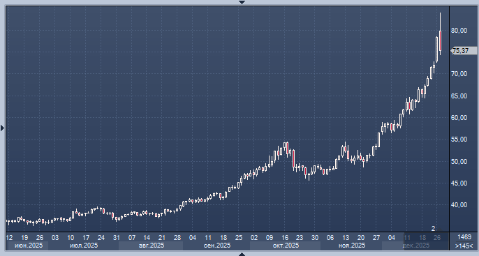 Цена на драгоценные металлы упала более чем на 5% после достижения исторического максимума в 84 доллара за унцию. В течение дня она неоднократно менялась, отклоняясь от уровня закрытия предыдущей сессии. Ослабление доллара и усиление геополитической напряженности сделали драгоценные металлы более привлекательными в период предновогоднего бычьего рынка, который также способствовал рекордным максимумам для золота, платины и палладия на прошлой неделе.