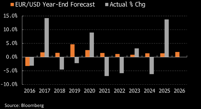 Последние девять лет подряд аналитики ждали роста курса евро против доллара, однако в реальности пара снизилась в пяти случаях и выросла лишь в четырех.
